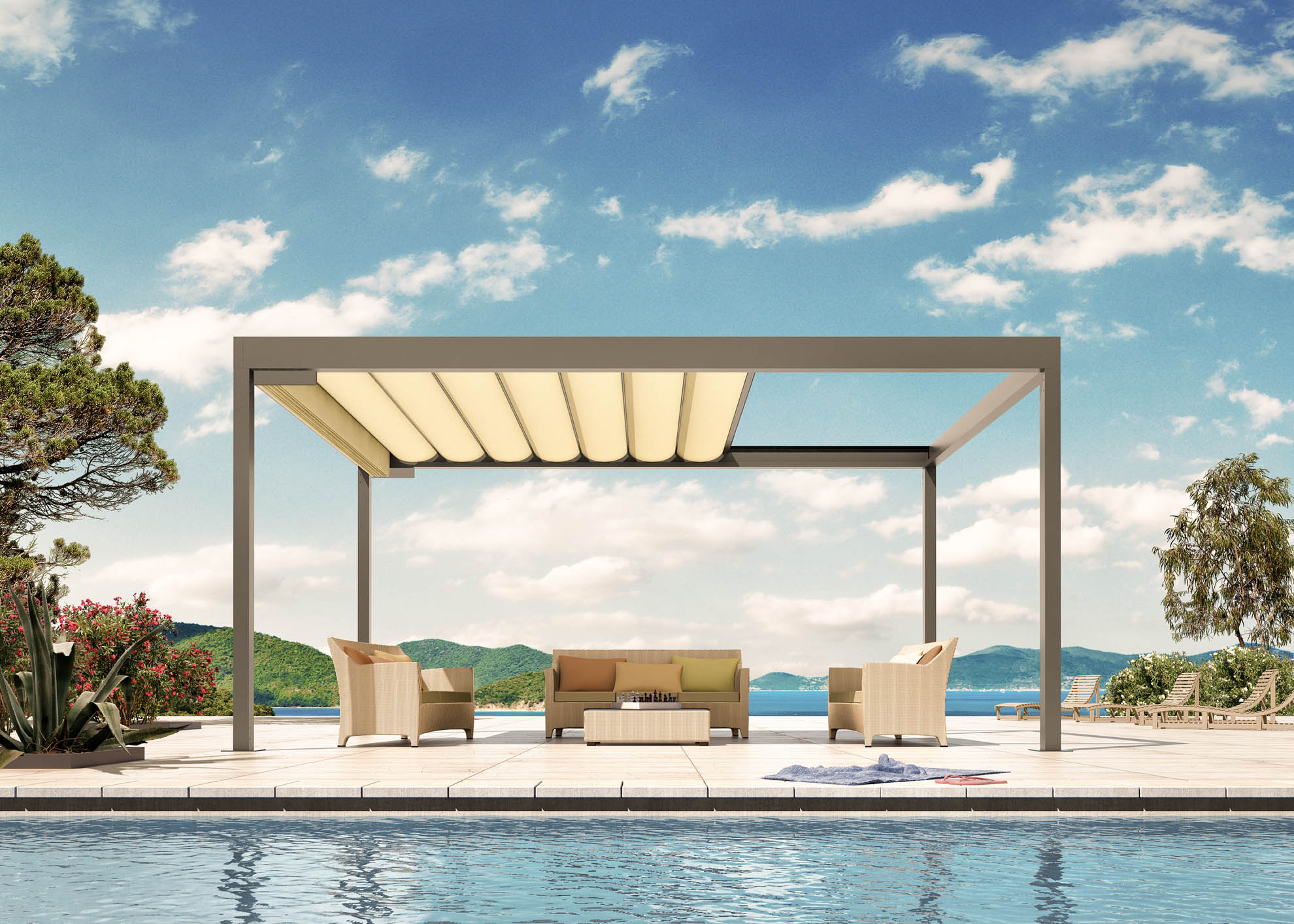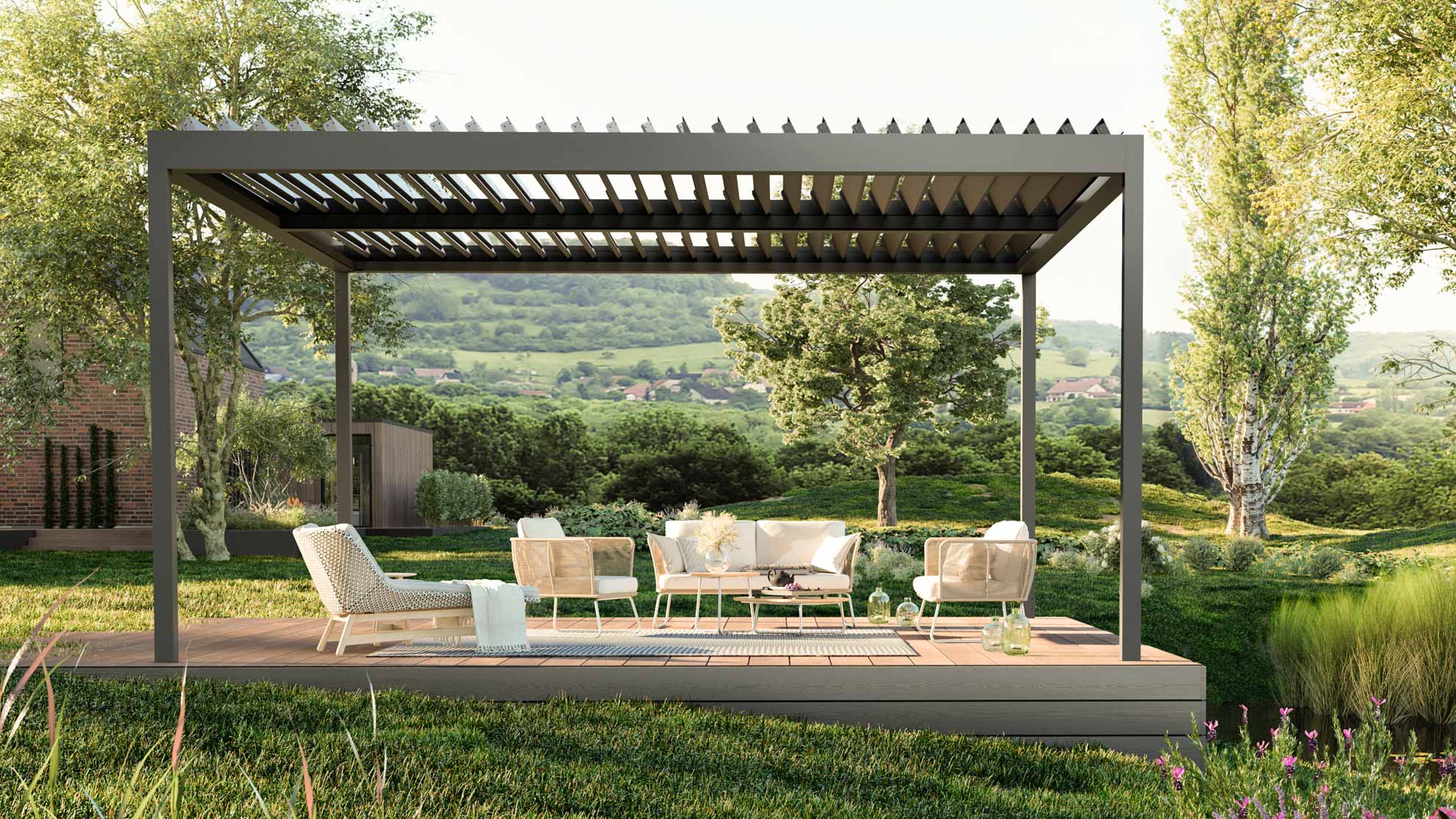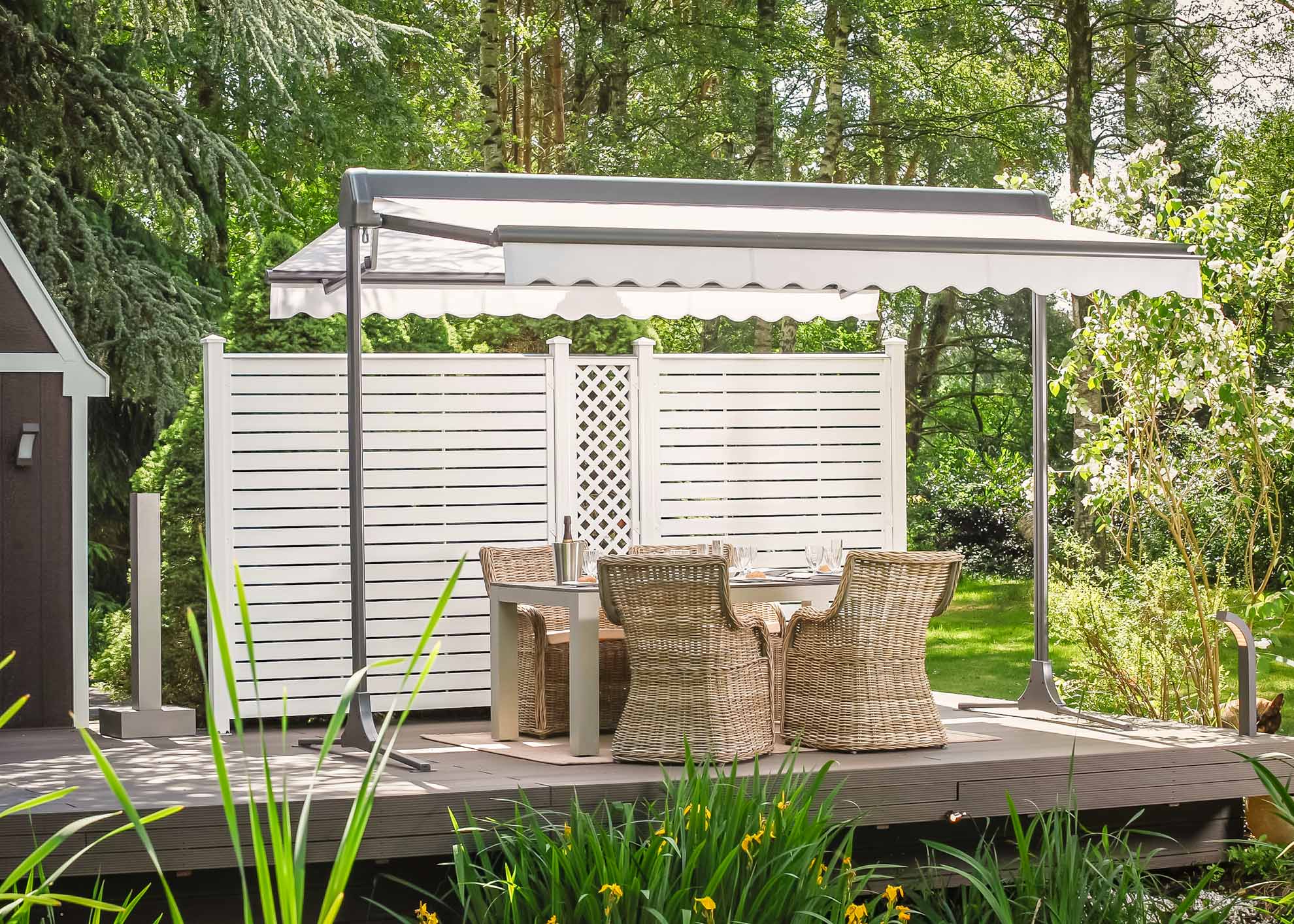 Freistehende Anlagen schaffen im Garten Schattenplätze und kommen dabei ganz ohne Befestigung am Gebäude aus. Weitverbreitet sind die hochwertigen Konstruktionen von Bavona: Mit schwenkbaren Lamellen schaffen sie flexibel regulierbaren Schatten und Lichteinfall.